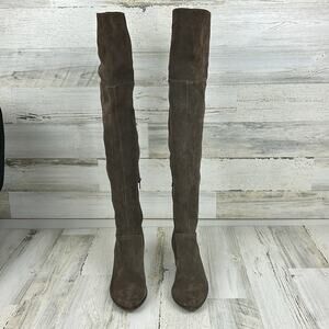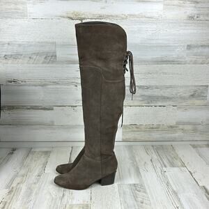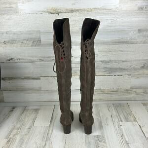 Aldo womens sz 7 gray suede over the knee lace back heeled boots, bottom side zip closure and adjustable tie up back, medium heel, great pre owned condition, indentation on back right heel please see photos for condition details.