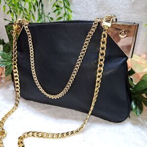 Beautiful and stylish black evening bag. Hinged sides with magnectic closure. Comes with 2 different length straps. One 20 in to carry like a clutch and one 48 to carry like a bag.