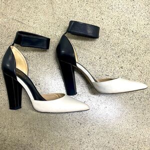 Black and cream leather pumps with block heels and thick ankle strap. The strap has a Velcro closure. Minimal wear, most noticeable on the soles. Heels are about 4”