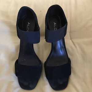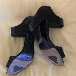 These black suede sandals have an elastic around the heel. Has a little bit of where on the heel but could clean up. Soles are dirty as you see in picture