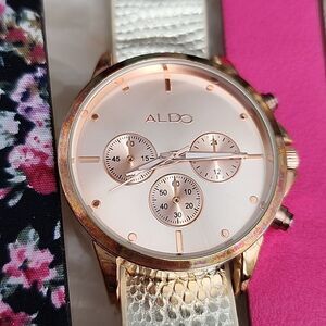 used condition,  signs of wear,  see photos for discoloration on the watch. Bands are new, only gold one was worn once. Battery needs to be changed.