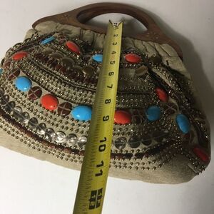 Aldo canvas khaki embellished with beads and polish wooden handle inside zipper and snap button pre owed in good used condition have two loose beads see pictures no tear normal signs of wear.