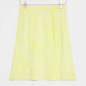 Aldomartins (Anthropologie) NWT women's chartreuse VALENCIA knit mini skirt. Designed and made in Spain, this skirt is impeccably tailored and has a distinctly European flair. Mini silhouette. Pull-on styling with elastic waist. Size Large. Length 19.25", Waist 16.5", Hips 21.5" laying flat. 65% Viscose, 35% Polyamide. Hand wash cold.
