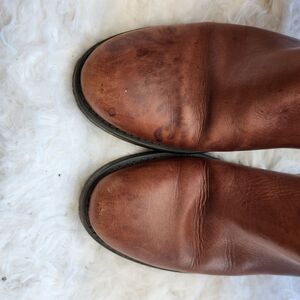 medium brown riding boots. side zip. Preloved condition. All sections of interest as well any known flaws have been documented in the photos and noted as thoroughly as possible. if there are no known flaws, none will be noted. Please feel free to ask any questions before purchase đ. Please see photos for measurements shown.