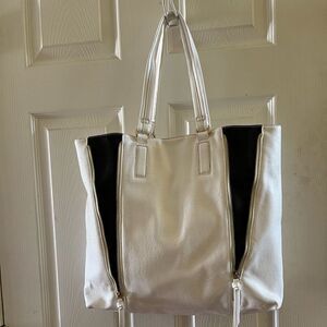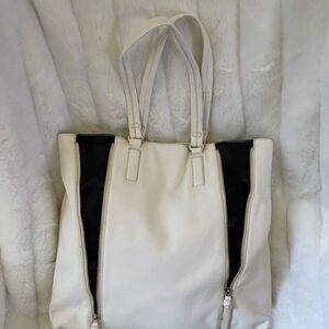 Aldo white and black large tote with gold tone zipper accents snap closure the spacious inside lining has a zipper compartment a side zipper two side pockets gently used clean no tear see all pictures any questions please message.