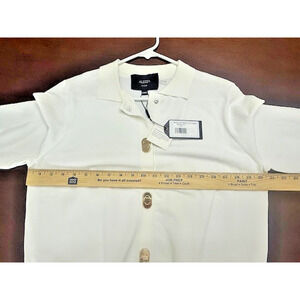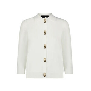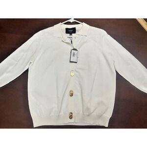 The Aleeza Paris Barbara Gold Hardware Knit Cardigan Sweater XL is a stylish and versatile piece with a solid white/ivory color, long sleeves, and a collared neckline. This casual sweater is perfect for all seasons and features a regular fit for a comfortable and flattering look. The cardigan's knit fabric and XL size make it a chic and cozy addition to any woman's wardrobe, suitable for various occasions and events.