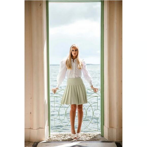 This Aleeza Paris mini skirt features a charming green and white houndstooth pattern. The high-waisted design and A-line silhouette create a flattering fit. Crisp pleats add a touch of preppy style and playful movement.