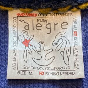 Alegre Vintage Jacket and Skirt Set. Excellent used condition. Hand painted. Blue tone with hand painted design. Jacket has colorful trim at collar and cuffs. Skirt gas elastic waist and vented back. Jacket size medium, skirt size large. Measures jacket chest 43", length 24", sleeve 22.5". Skirt waist 28", length 28.5".