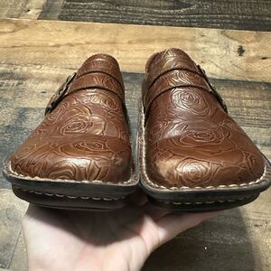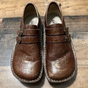 The Alli Choco Gold Rose is a charming addition to your Alegria shoe collection! This women's loafer style shoe features a beautiful embossed leather upper with warm brown and gold tones for a casual look. Gold stitching and two simple gold buckles (which hide an easy velcro closure) make this shoe a staple for your fall and winter wardrobe! Amazing adjustability for that hard to fit foot! It also has a generous toe box so that your toes can spread out, reducing metatarsal pressure and reducing overall foot fatigue.