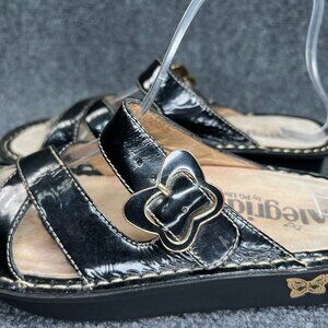 Alegria Barcelona sandals women's black patent leather PG Lite butterfly buckle flip flops in gently used condition!