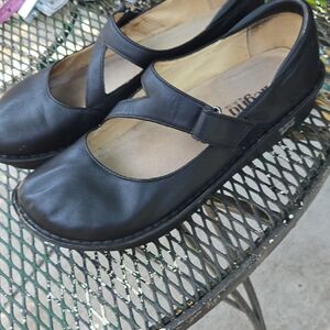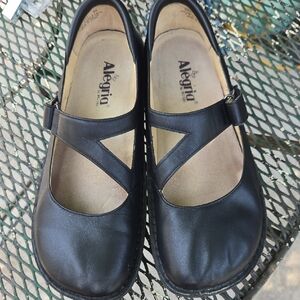 Experience all-day comfort with Alegria's black flats, featuring a sleek leather upper and crisscross elastic straps for a secure fit. These practical shoes boast a rounded toe and a flat sole, making them ideal for both casual and business casual settings.