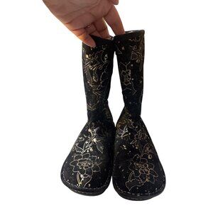 Alegria Black Floral Embroidered Mid-Calf Boots With Side Zipper & Butterfly Log