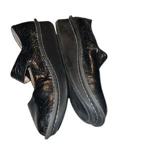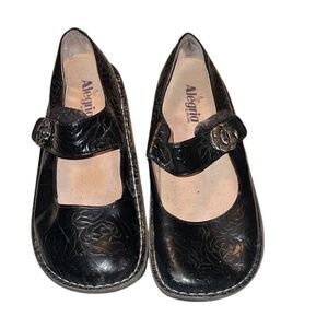 These Alegria dress shoes in black feature a classic Mary Jane design with a glossy leather finish. The single strap with a decorative closure adds a touch of elegance, while the sturdy sole ensures comfort for any occasion. Good condition some scratches on toe. See pictures.