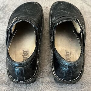 Step into style with Alegria's black platform shoes, featuring a striking embossed pattern and a glossy finish. These shoes offer a comfortable platform sole, perfect for adding height and support. The decorative straps with silver buckles add a touch of elegance to this versatile footwear.