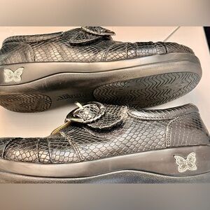 Alegria black leather loafers with a unique texture. Features a stylish silver buckle accent. 6.5 US and 37 EUR. See photos for condition