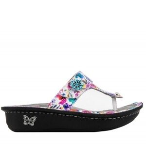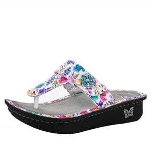 In excellent used condition no rips, tears or stains. Our most popular thong sandal in this fresh and floral new look will surely bring a smile to your face. Petals of pink, purple, and blue decorate the Carina in Perennial Crackle and a gorgeous sky blue flower serves as the buckle on the adjustable strap. Our classic mild rocker outsole paired with our patented footbed will bring you the best in comfort while you worry about staying stylish relaxing pool or beach side.
