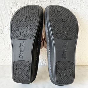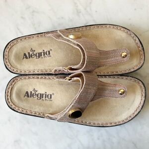 Alegria Carina women's size 37/6.5 thong sandals. Beige, pink and metallic gold leather thong upper with adjustable hook and loop closure and decorative gold tone button. Suede insole made from blend of cork, memory foam and latex. Wedge heel rubber outsole engineered to provide a natural rocker walking motion that reduces stress on muscles and joints. Style #CAR-817. Excellent condition.