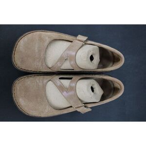 Alegria Dayna Desert Essence Women's Mary Jane Shoes in size 6. These brown walking shoes feature a round toe, hook & loop closure, flat heel, leather upper, rubber outsole, and foam insole for comfort. The shoes are designed for travel, activewear, casual wear, and workwear, with adjustable straps and a breathable fabric blend. Perfect for various activities like walking, running, and yoga, these versatile shoes offer both style and performance.