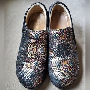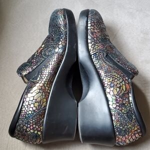 Melodrama never looked so good as the Alegria Eryn in Show Stopper. This pink, green, and blue pattern of colors is overlaid with a lizard print texture and lots of shine. Designed to match any and all outfits you won't run out of opportunities to wear these career fashion wedges. With double elastic gores at the instep you can slip them on and off with ease and the patented removable footbeds are made with memory foam and cork for a custom fit only Alegria can provide. Other reasons to get these before curtain call include: