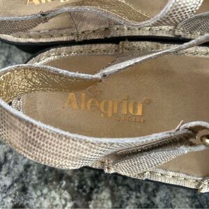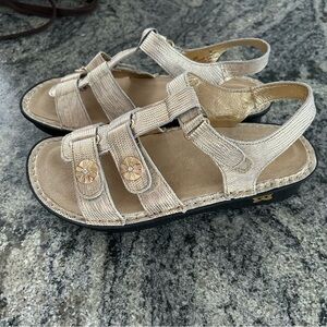 Experience ultimate comfort with Alegria's gold sandals, featuring multiple adjustable straps and a cushioned footbed for all-day wear. These stylish sandals are perfect for casual outings, offering a blend of elegance and practicality with their sturdy design and decorative stitching. New without box