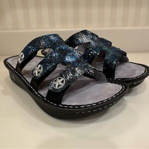 Alegria Leather Dinah Deep Sea Sandal with strap detail. Three straps with starfish embellishment and hook and loop closure for a perfect fit. Blue and green leather upper. This summer you'll want only one thing on your feet: Alegria sandals. These will pair with jeans, shorts, skirts, dresses - you name it, it will match. Whether a day at the beach or a day at work your feet will be comfortable. Straps secures in three different places for a custom fit. The leather-covered latex insoles make every step feel incredible.