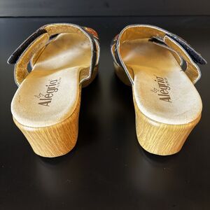 Embrace the harmony of style and comfort with the Alegria Linn Black Leather Embroidered Floral Sandals. Perfect for a variety of occasions, from a casual day out to a cocktail party or even a wedding, these versatile sandals are designed to keep your feet supported and stylish. The vibrant floral pattern adds a touch of bohemian elegance, while the adjustable straps ensure a personalized fit. Crafted with high-quality leather, both inside and out, these slide sandals feature a cushioned insole and a comfortable wedge heel for all-day wear. The breathable material and arch support make them ideal for any season, whether you're strolling through spring or enjoying an autumn evening.