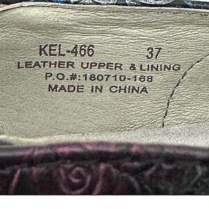 The Alegria Multicolored Embossed ROSES Leather Comfort Shoes in size EU 37 (US 7-7.5) are slip-on mules designed for women. They feature a multi-colored upper made of embossed leather with a rose theme, providing a stylish and unique look. The shoes are crafted for comfort with a foam insole and polyurethane outsole, making them ideal for walking and casual wear. The Alegria Kel-466 model offers a blend of functionality and fashion, perfect for those seeking both comfort and style in their footwear.
