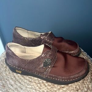Alegria Slip On Platform Shoes. Brown Fabr Upper with Metallic Gold Details and a Velcro Closure Strap. Size 38 = US Size 8-8.5 size chart in photos. Great Condition 🚭