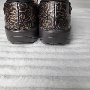 These Alegria by PG Lite professional clogs feature a richly detailed embossed floral pattern in black and copper tones with leather uppers and lining. Designed for all-day comfort, they include slip-resistant soles, soft padded insoles, and elastic gores for easy wear. Labeled EU 36, but fits more like a US women's 6.5–7. I normally wear a 7 and they fit comfortably Style code KEL-548.