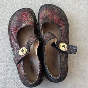 The Paloma Collection is Alegria's twist on the classic Mary-Jane style. Featuring signature Alegria rocker outsole and supportive footbed. This classic style is a fun, funky and superbly comfortable shoe. The Paloma Brown Pebble is a sueded leather, Rich browns, red, tans and coral run throughout this print. Gold button covers hook & loop closure and gold stitching make this one classy shoe! Metallic Pebble Mary Jane Clog Alegira Pal-232 Brown-red metallic colors Good Condition no flaws. good soles