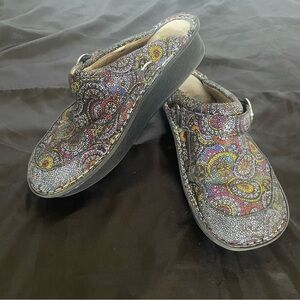 These Alegria Seville Spiro Multi Clogs are a great slip resistant pair of shoes. They are size 38. Some of the padding is showing inside the left shoe. They are worn, but the soles are still in great condition and the insoles are replaceable.
