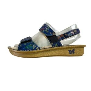 Colorful hummingbirds on a background of deep blue make the Alegria Verona sandal in Birdland fly right into its place in your shoe repertoire. With a light wood-grain look on the mini rocker outsole and the comfortable, signature removable footbed you've grown to love in Alegria shoes, this is one sandal you'll feel right at home in. It features a leather upper and lining in the slingback strap design and three adjustable straps with hook-and-loop tape to fit exactly to your foot any time of the day. Match this quirky and fun print with all your festive spring looks. Other features you're going to adore include: Structured, flat, and stable outsoles that also promote better posture. Superior arch support. Heel height: 1 inch (Size 38=8/8.5)