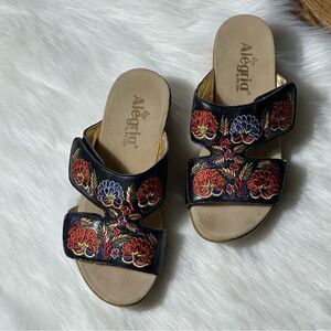 Step into comfort and style with Alegria's embroidered black sandals. Perfect for any casual outing, these sandals feature vibrant floral designs that add a touch of elegance to your look.