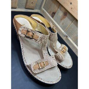 Crafted for both style and comfort, these Alegria sandals feature leather uppers with a chic snake print. The wedge design offers a subtle lift, making them suitable for everyday wear. Adjustable buckle straps ensure a secure fit, while the neutral beige and brown tones provide versatile styling options.