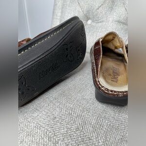Alegria Womens SZ 35/US 4-5 Brown Black Swirl Patent Leather Clogs Slip On Shoes.