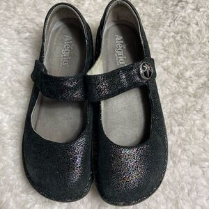 Alegria leather black suede Mary Jane with multi color sparkling glitters EUR41 Velcro strap closure Pre Owned in good used condition the right shoe is missing the silver tone brooch.see all pictures any questions please message.B12
