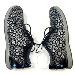 Used in excellent condition Alegria Essence Night Poppy black and silver sneakers. Built for comfort and style. Soft leather upper with a tone on tone poppy motif emblazoned in the leather. See photos for additional information.