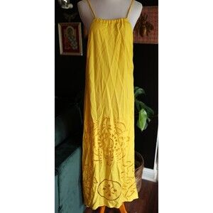 Vibrant yellow maxi dress. Intricate embroidery detail. Perfect for summer.