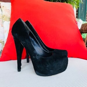 Black leather Alejandro Ingelmo pumps with round toes and covered platforms and heels. 6” Heel ht and 1.5” platform ht. Missing part of pony hair but the over all look is amazing.