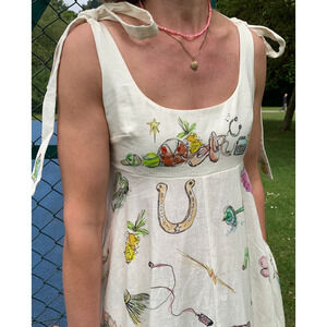 The Alemais Anouk Colantoni Ballet Midi Dress, a collaboration with artist Anouk Colantoni, features a whimsical linen print of flora, fauna, and sporty elements, finished with tie straps and a shirred back.