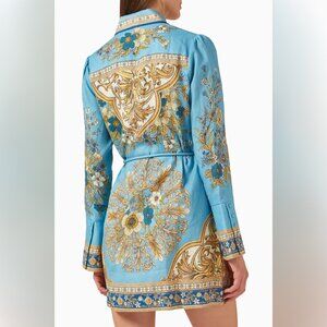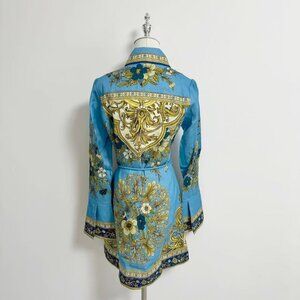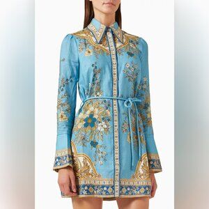Inspired by vintage florals and tailored elegance, this mini dress captures a sense of nostalgia with a modern twist. Its structured silhouette is softened by gentle gathers and romantic prints throughout. A self-tie belt adds definition to the waistline.