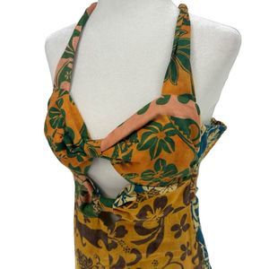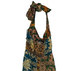 Elegant midi dress with a vibrant floral pattern. Features a mix of earthy tones and intricate designs. Perfect for a stylish outing.