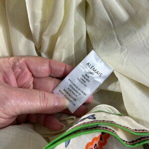 Alemais Womens Size 6 Linen Mini Dress Tropical Mermaid Fish Button Front Cotton Lining Pockets Hand Wash Designed in Australia in good preowned condition.