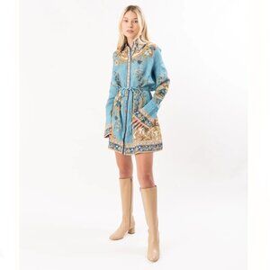 This mini dress is made of printed linen and features flared sleeves and an oversized neckline.