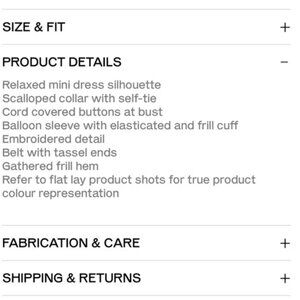 100% cotton. Made in India. Dry clean only. Unlined. Pull-on styling with partial front button loop closure with neck-tie.Optional waist tie with tassel ends. Smocked design at sleeve. Embroidered design throughout.