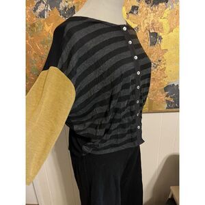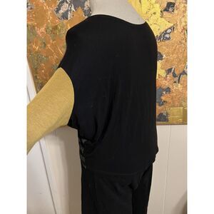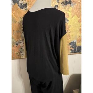 From my overstuffed closet..This is a super fun and unique boxy top from Alembika, another of my favorite designers! This has a buttoned up front or back, depending on which side you decide to wear in front! They both work! the 3/4 sleeves are gold. Just great with black pants! This is a rayon blend to hand wash and line dry. The condition is gently used, no visible flaws. Measurements are taken flat, unstretched, then doubled, and are as follows: