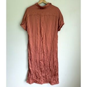 Roll it up and toss it in your carry-on—crinkle is your best travel partner. This woven satin shirtdress in a soft coral hue is cut for relaxed comfort yet always looks chic. Pullover silhouette with spread collar, half-button placket, soft drop shoulders and cuffed short sleeves.