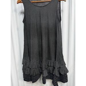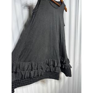 Black-and-white sleeveless tunic with layered hem and mixed patterns. Relaxed silhouette, soft stretch knit. Size M, excellent condition.