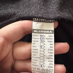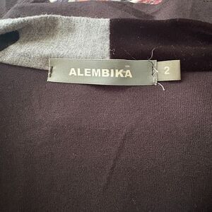 This striking long sleeve tunic top by Alembika features a bold, asymmetrical patchwork design in black and gray with polka dot and velvet contrast panels. Made from a luxe blend of viscose, cotton, polyester, wool, and elastane, it offers a comfortable stretch with an artful silhouette. The modern soft drape flatters the figure, making it ideal for elevated casual looks or artsy layering. Style it with black trousers or leggings and boots for a creative, gallery-ready outfit. Vanity size 2, which is equivalent to a US women’s size 8–10.