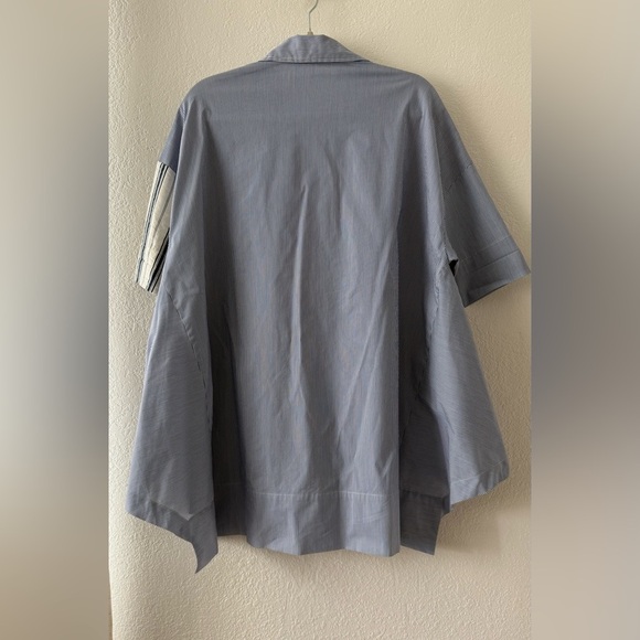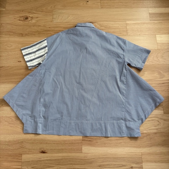 A beautifully balanced mix of stripes and our embroidered linear dot combine in our meticulously tailored button-down shirt, cut for breezy freedom of movement in an A-line silhouette with spread collar, drop shoulders, short elbow-length sleeves (to roll or not), button front, chest pocket and notched hi-lo hem.